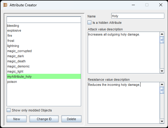 In this example we create a new Attribute called 'Holy'. This means we can have 'Holy Damage' and 'Holy Resistance'.