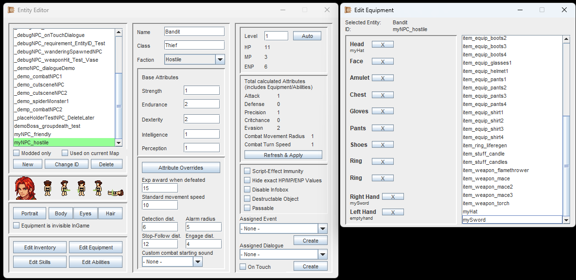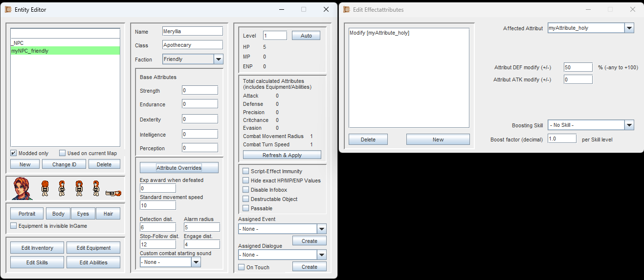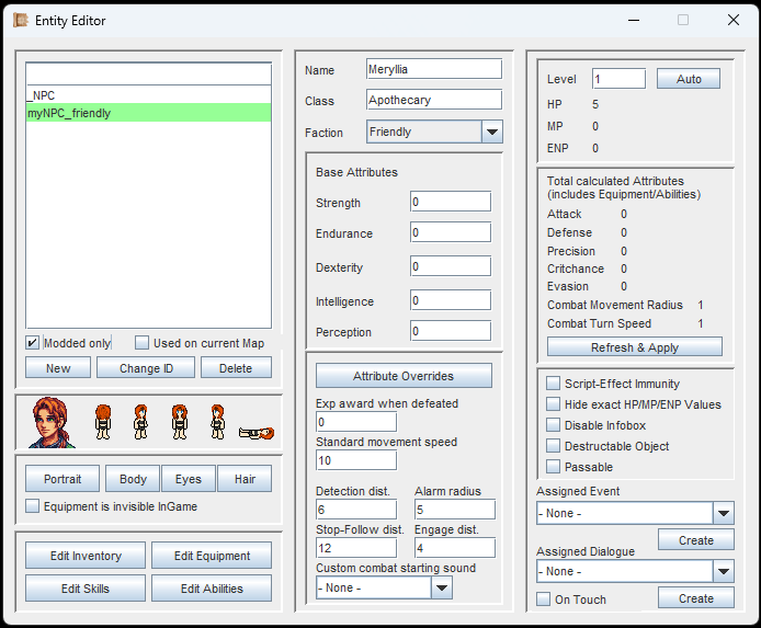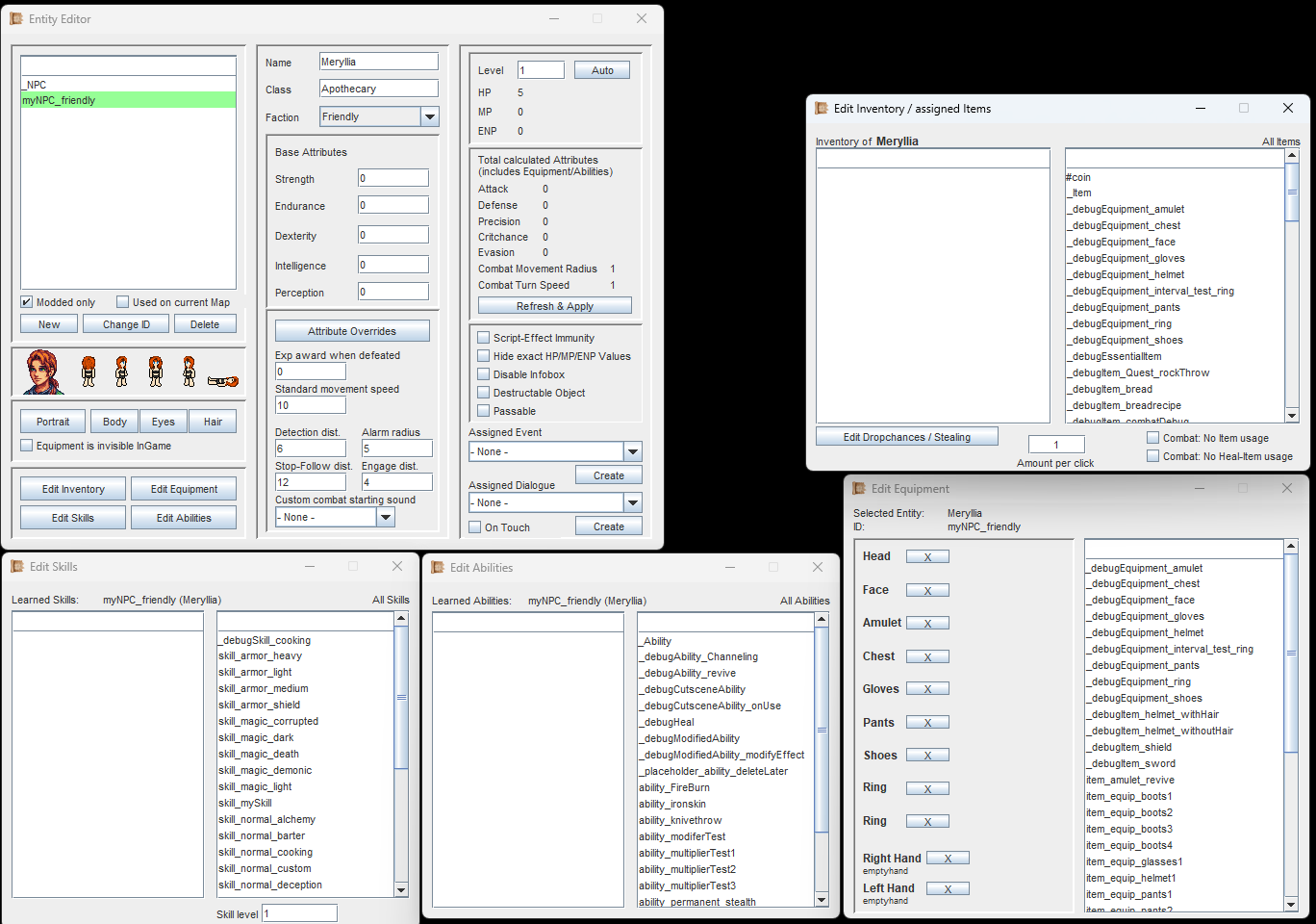 Creating an Entity is as simple as clicking the 'New'-Button and assigning it a unique ID. From there on, a lot of the settings you see should remind you of the in-game character creation.