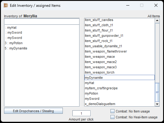 Through the use of EventBits (we come to them later) you can create various Stealing-Abilities. One stealing attempt will take 1 item from the NPCs inventory (or a random amount if its a stack).