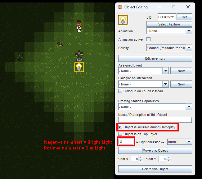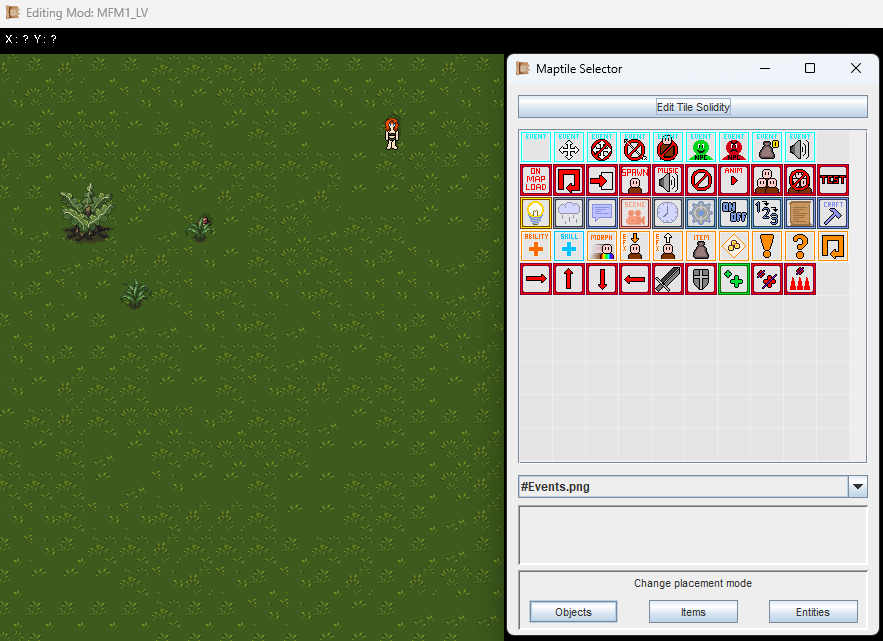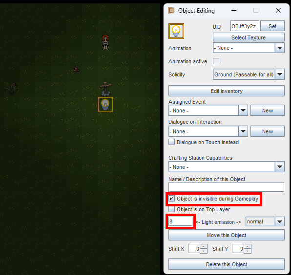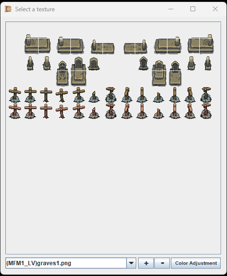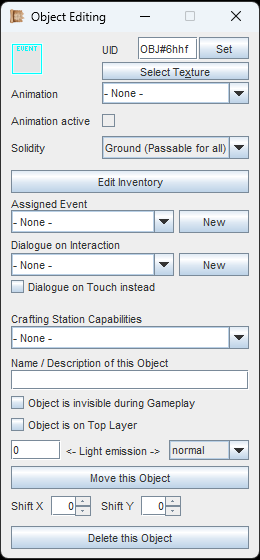 At the top-left you see the Object's current Texture. If you click on 'Select Texture' you can pick a new one. Objects use the same Textures as Maptiles. Remember all those colorful icons when you looked at the Maptile Selector? Those are actually made for Objects with Events, so the Modder (You) can easily see what these are for.