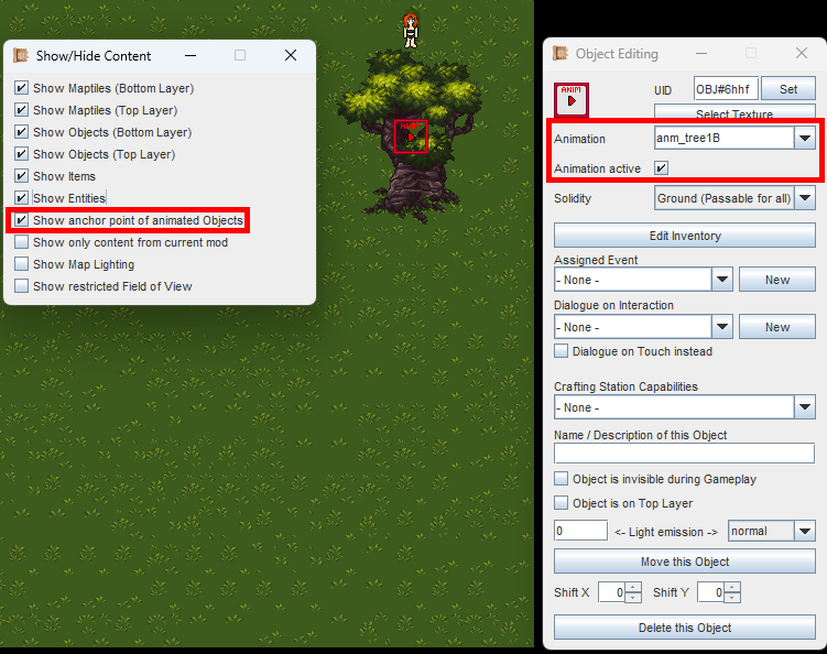 You can create a looping 1-frame Animation (basically an image), and use it for an Object. That way you can use a large texture. But: Keep in mind that the Solidity only affects the singular tile where the Object is on. In the image to the left, the player could technically walk through the bottom part of the tree. You can address this, by creating new invisible Objects with a 'wall' solidity, which you place where the player is not allowed to go.