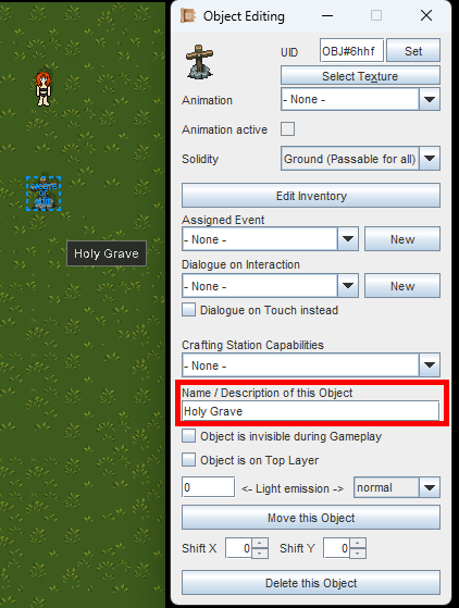 In this example, we have created an Object with the texture of a grave, and gave the description 'Holy Grave'.