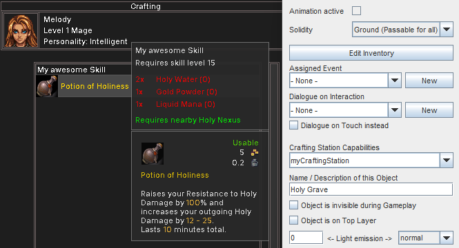In the example to the left, we gave the 'Holy Grave' the crafting station 'Holy Nexus'. The recipe we want to craft requires exactly this 'Holy Nexus' crafting station. If the player stands next to it, the recipe will become craftable.