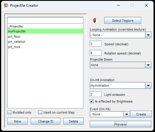 Projectiles are needed for ranged weapons and Effects. After creating your Projectile with a unique ID, you can either assign a Texture or an Animation (which will play instead of showing the Texture).